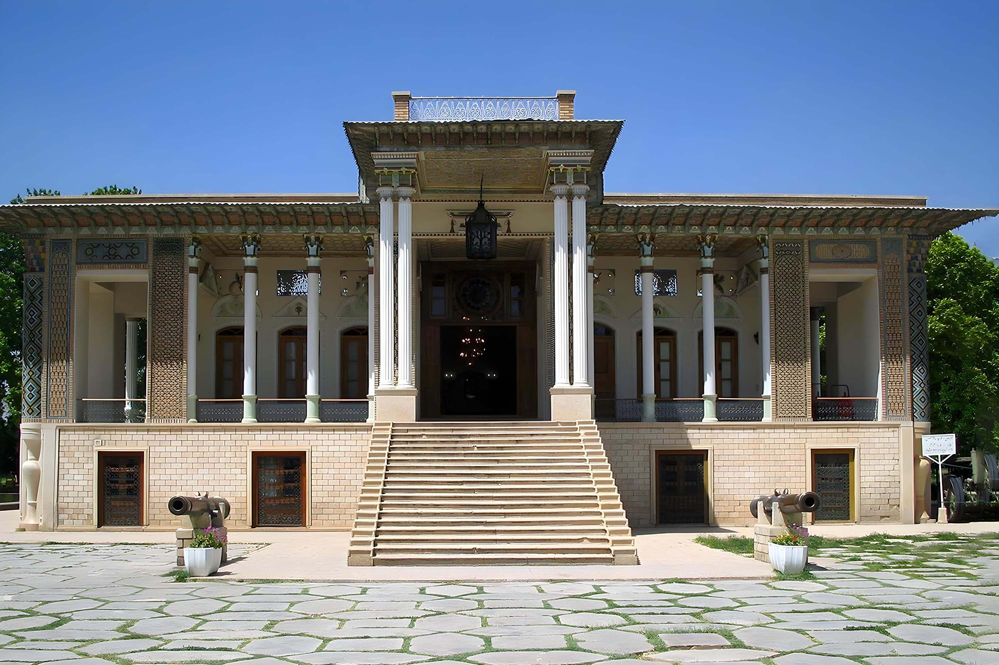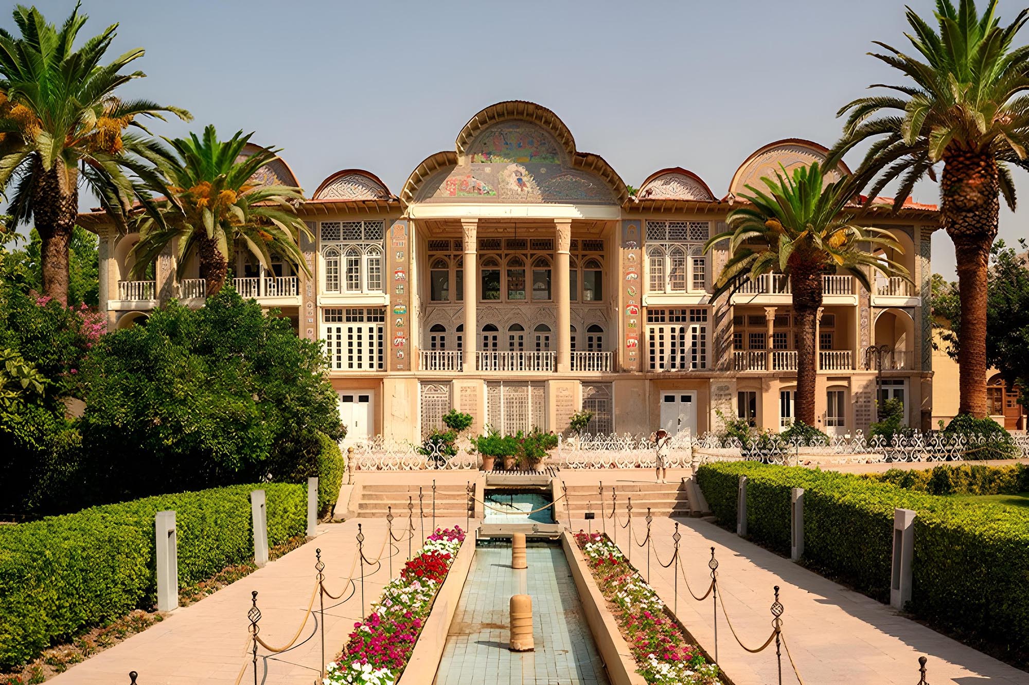 باغی زیبا در شیراز با معماری چشم گیر و تزئینات شیشه ای که برای عکاسی از جزییات هنری مناسب است.