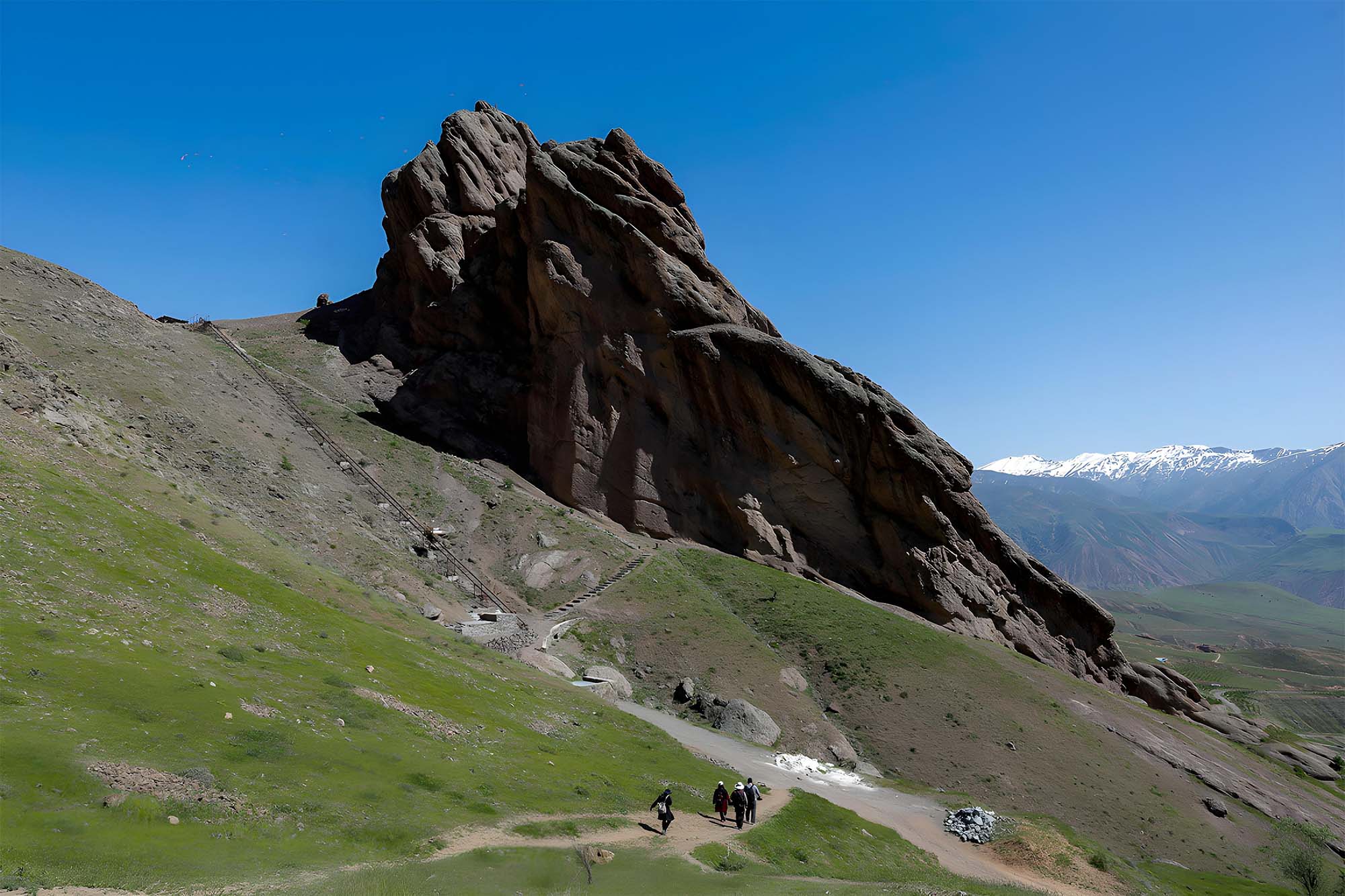 قلعه ای تاریخی با چشم انداز کوهستانی که برای عکاسی از تاریخ و طبیعت مناسب است.